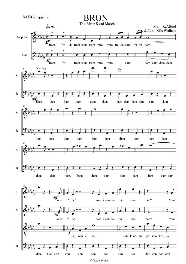 Marschen BRON är en variant på “The River Kwai March” av Kenneth Alford – Temat ur “Bron över floden Kwai”. Här är den försedd med en skämtsam text ur låtar som handlar om broar. T.ex. “Bockarna Bruse”, “Bro bro breja och “Som en bro över mörka vatten”…. Arret är skrivet för SATB à cappella.