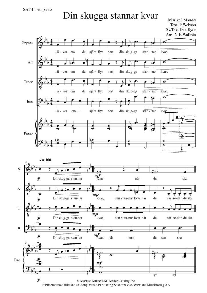“The Shadow of Your Smile”, även känd som “Love Theme from The Sandpiper”, är en populär sång med musik av Johnny Mandel och text av Paul Francis Webster. I Sverige spelades ”Din skugga stannar kvar” in av bland annat Lill Lindfors och Siljabloo. Den blev mycket populär och hamnade högt på de svenska topplistorna. Här finner du den arrangerad för 4-stämmig blandad kör (SATB) och piano i en lite udda version.