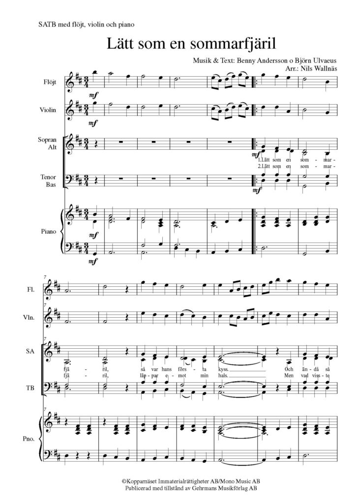 Denna vackra låt från 2001 av Benny Andersson/Björn Ulvaeus spelades in samma år med BAO (Benny Anderssons Orkester) och Helen Sjöholm. Här har den arrangerats för blandad kör SATB med flöjt, violin och piano.